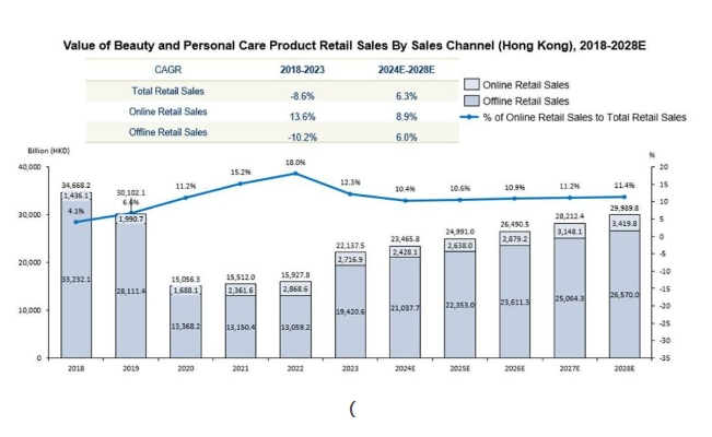 纵观香港美容及个护零售近几年发展概况,“波动”与“复苏”两大关键词可谓贯穿始终。受疫情影响,2020年和2021年,香港美容及个人护理市场销售额一度下滑,但2022年后逐步复苏